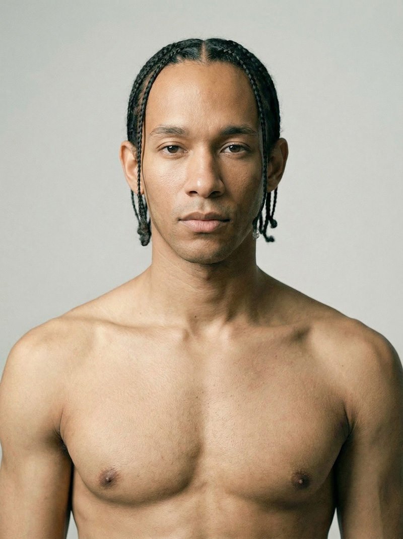Identity Look: High Smooth Forehead / Center-Part Braids / Heavy-Lid Gaze